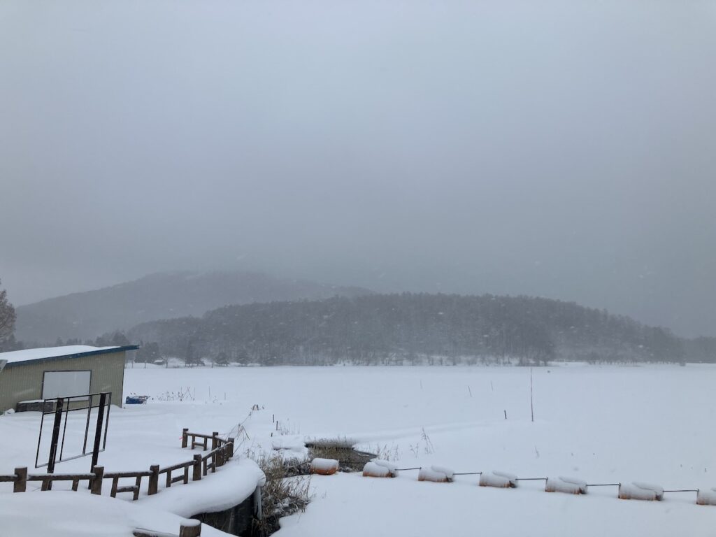 霊仙寺湖の湖面、氷の厚さの調査中?でしょうか。ワカサギ釣り解禁間近かも… -